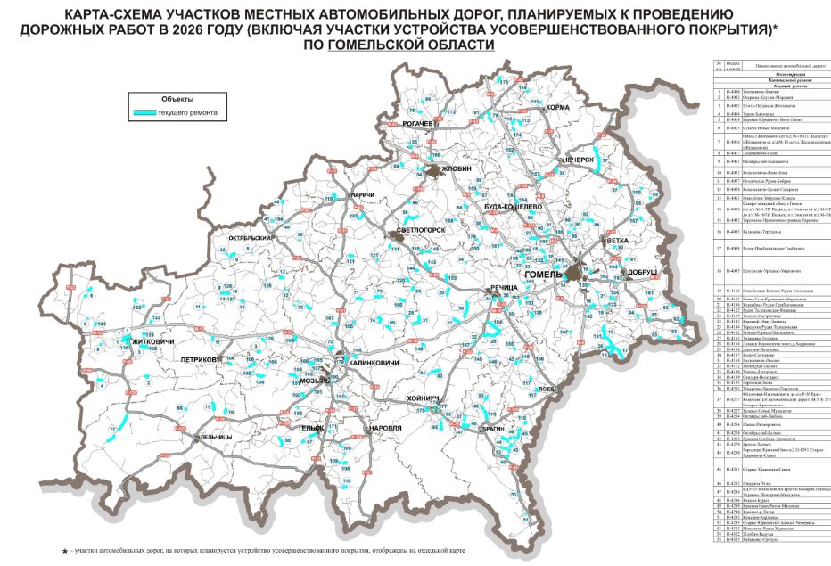 Министерство транспорта опубликовало карту дорожных работ на 2026 год. В планах — реконструкция, капитальный и текущий ремонт более чем на 150 участках дорог Гомельской области, включая ключевые республиканские трассы.