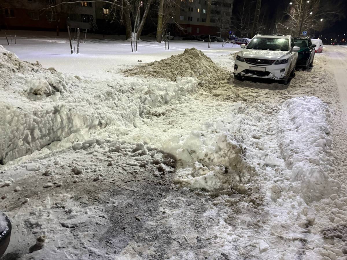 Встречаются и парковки со следами недавней уборки. Но рядом — автомобили, окружённые высокими снежными валами, и «нарядные» снежные шапки на крышах.
