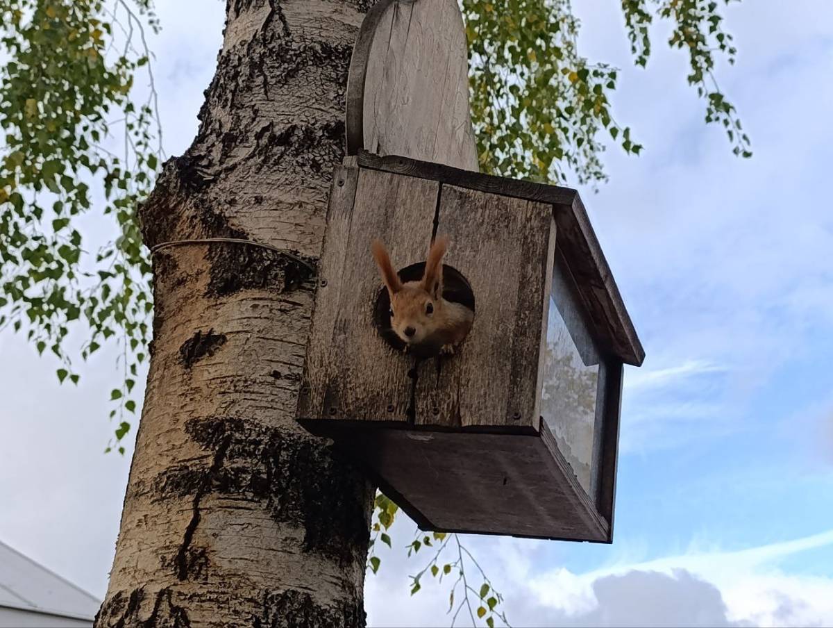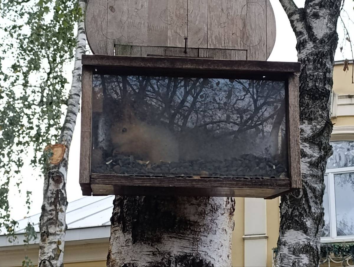 Домик-кормушка со стеклянным окошком находится возле ресторана «Ривьера». Работник заведения вынес семечки и загрузил их в кормушку на дереве. Ожидали, что обедать прилетят птицы, но буквально за пару секунд на «кухню» залезла плотная рыжая белочка. Активно поедая семечки, она несколько раз вылазила мордочкой на улицу, чтобы промониторить обстановку. И тут же возвращалась к обеду. В это время к кормушке подлетали птицы, но общепит для местных жителей парка был временно закрыт, а провиант активно уничтожался.