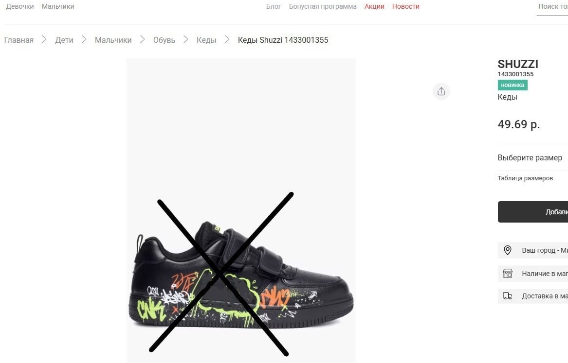 Речь идёт о товаре, реализовывавшемся через магазины и сайт сети Мегатоп. После выявления факта продажи обуви с запрещённой надписью товар снят с реализации, а на юридическое лицо составлен административный протокол.